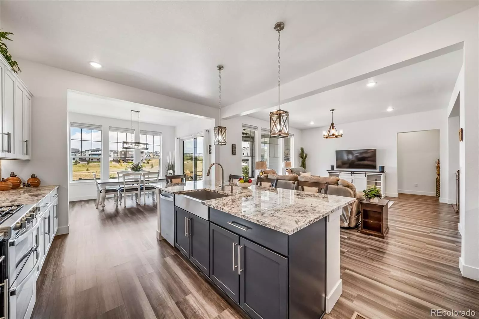 This “better-than-new” ranch in Montaine at Crystal Valley checks every box—backing to open space with over $130K in upgrades, an expanded covered patio for outdoor entertaining, two main-level bedroom suites, a chef’s kitchen with a massive island and walk-in pantry, and a finished basement complete with a second kitchen, theater room, offices, and guest space. Add in owned solar, low-maintenance turf and xeriscaping, and resort-style neighborhood amenities, and it truly offers the best of Colorado living.